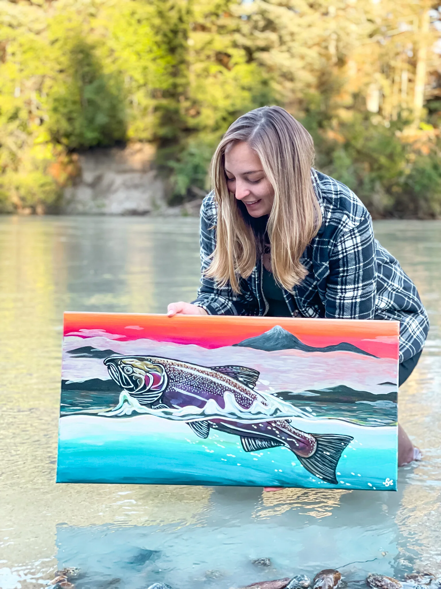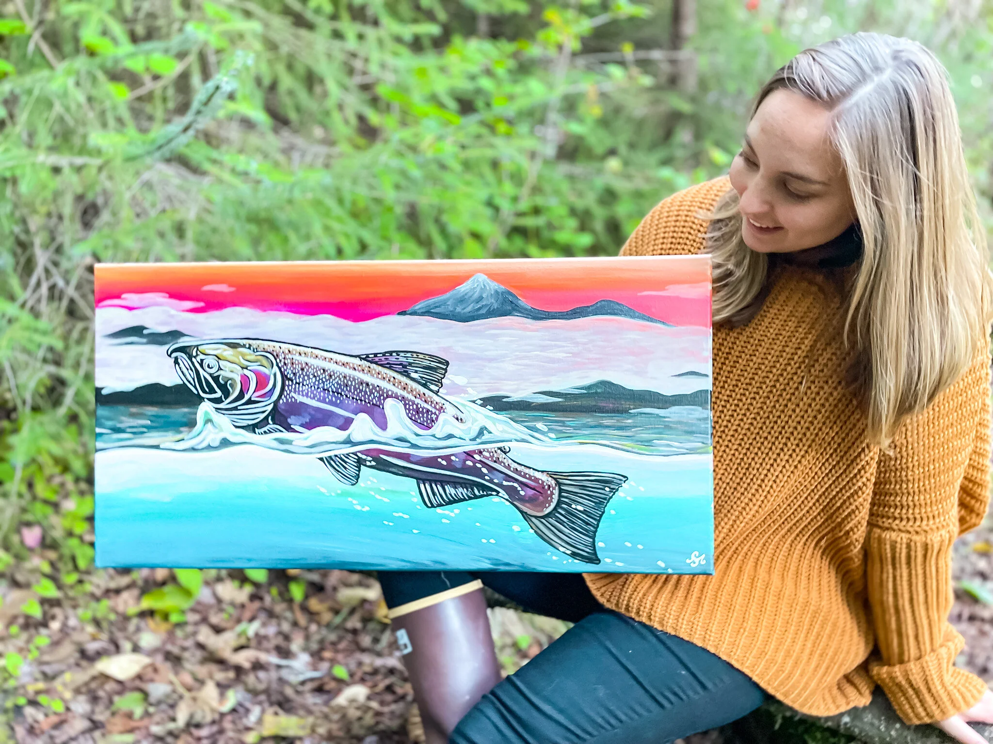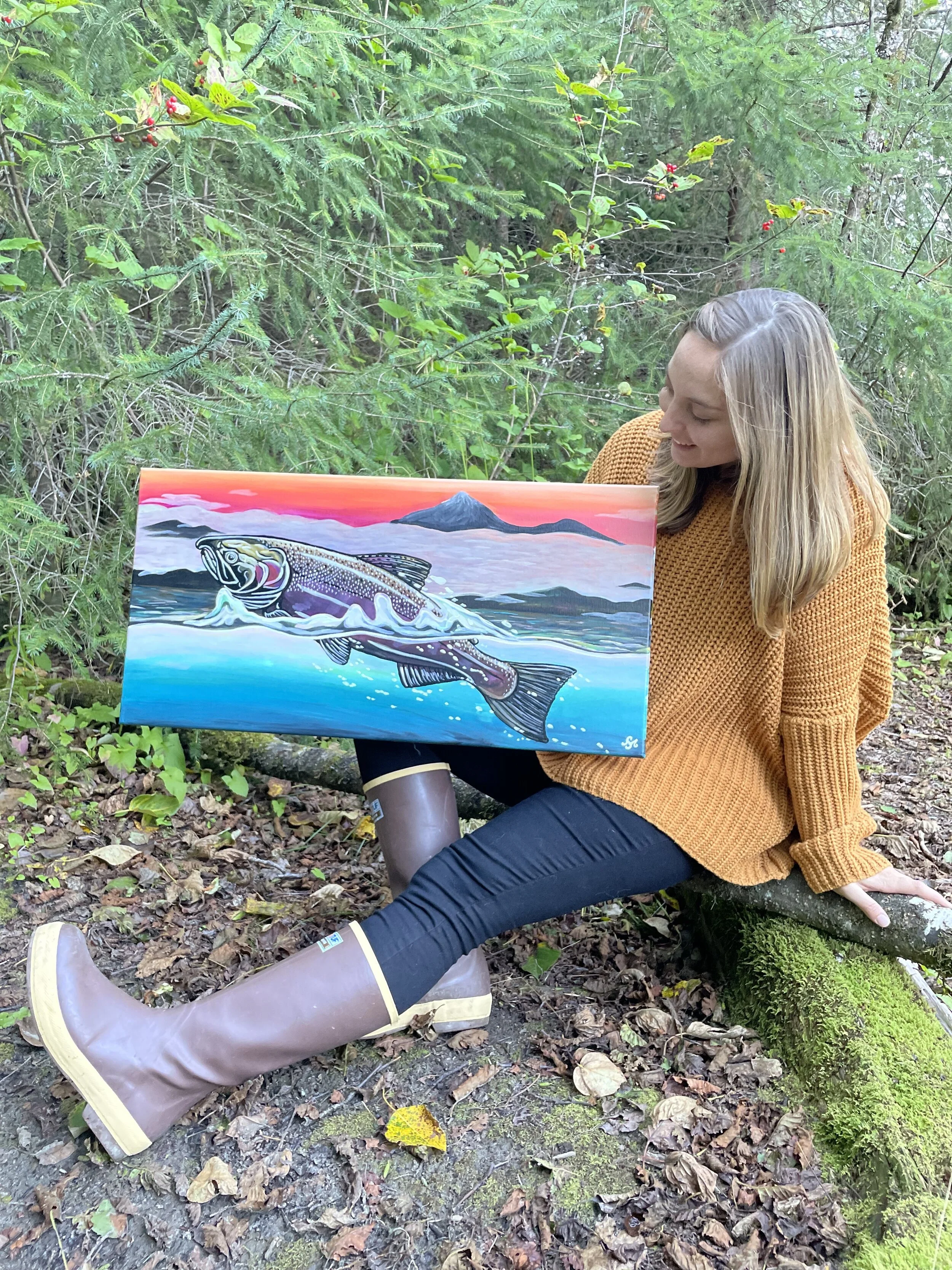 Image 1 of 5 Image 2 of 5 Image 3 of 5 Image 4 of 5 Image 5 of 5 Sunset Spawning Coho Salmon Sale Price: $300.00 Original Price: $400.00 sold out This original ShellART painting is on stretched canvas 15”x30”. Sold Out Added! This original ShellART painting is on stretched canvas 15”x30”.