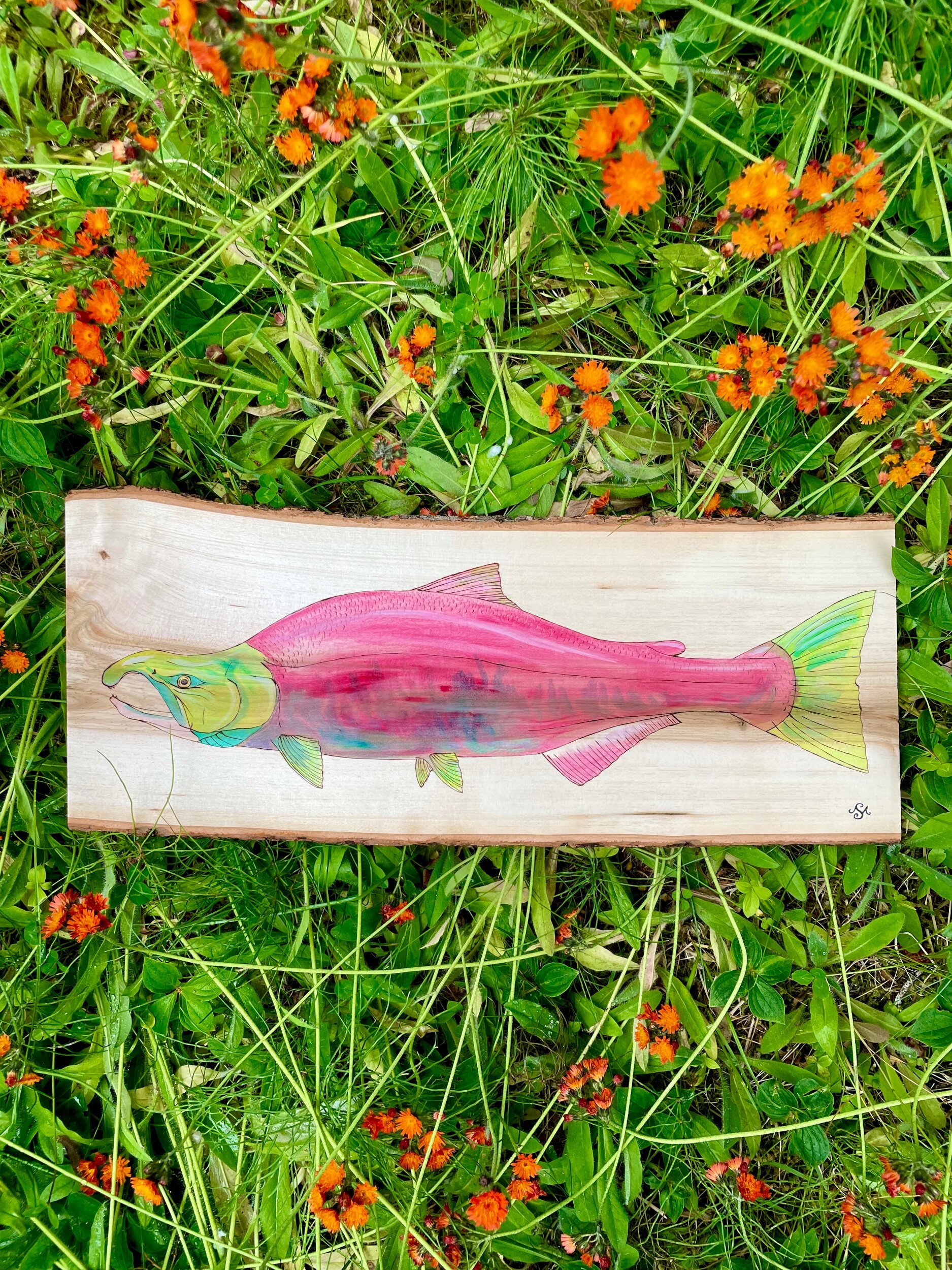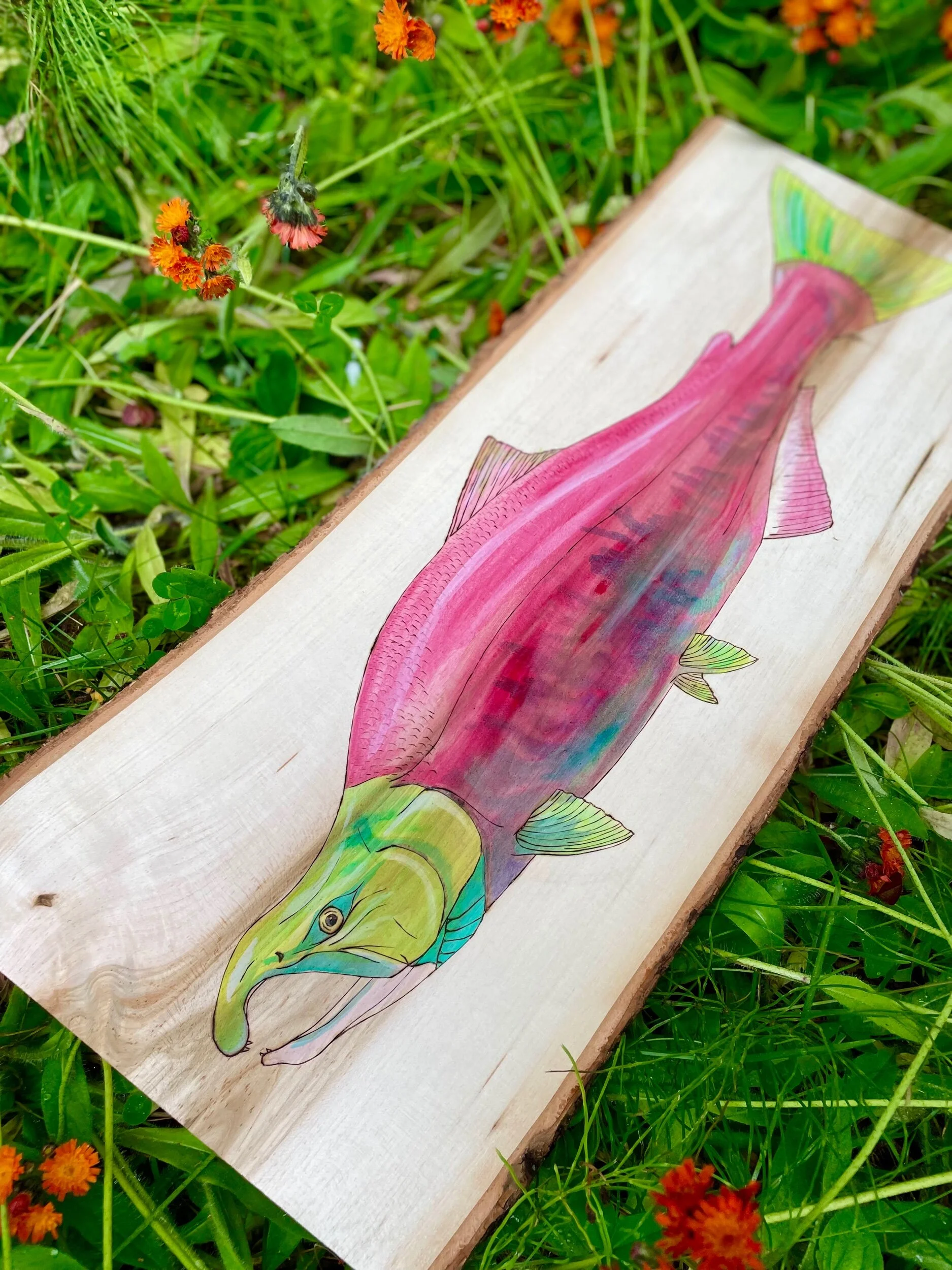 This original 23”x9.5” Spawning Sockeye artwork Is a mixture of wood burning and acrylic paint on an all-wood canvas. The item is sold with hanging hardware on the back.