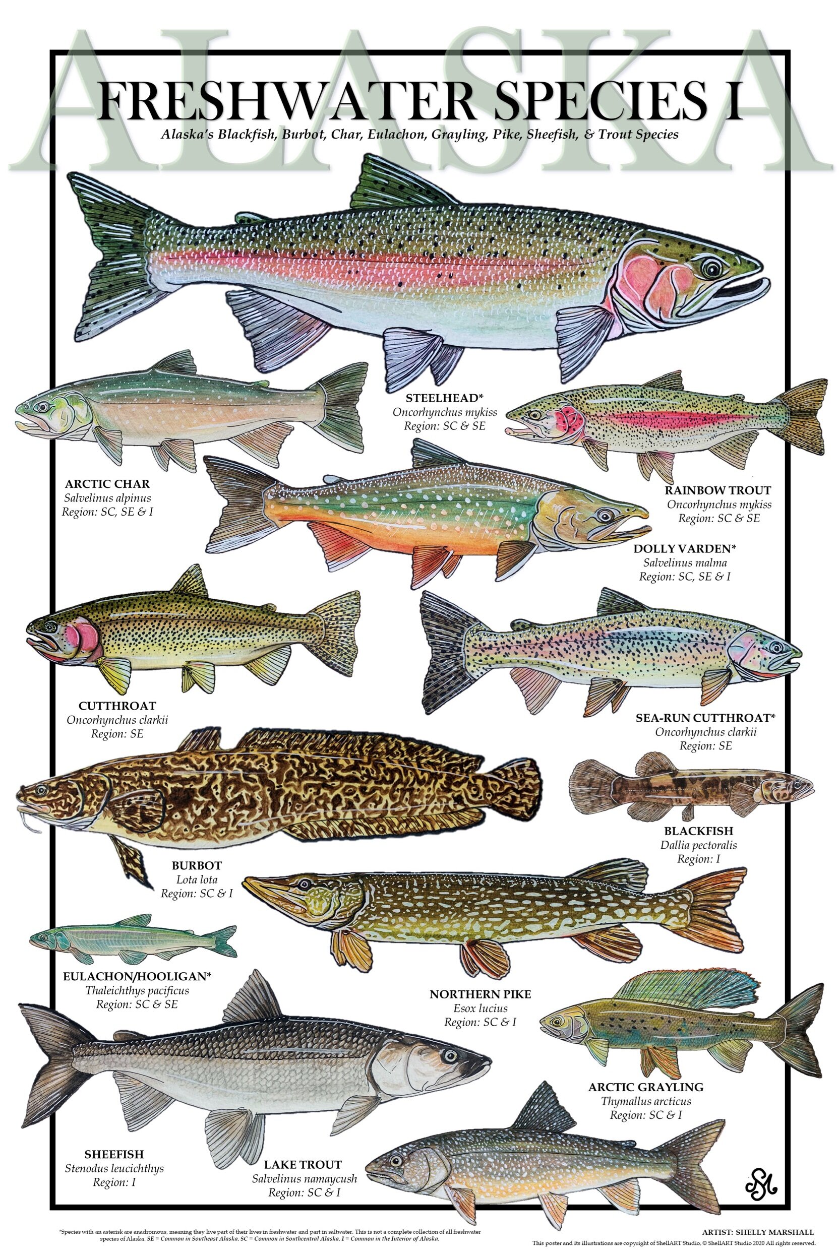 POSTERS ORIGINAL FISH SPECIES POSTERS Categories: All Saltwater Freshwater Salmon All Saltwater Freshwater Salmon Quick View Alaska Fish Species Collection 11" X 17" $40.00 Quick View Alaska Saltwater Species Poster 11" X 17" $15.00 Quick View Alaska Salmon Species Posters 11" X 17" $15.00 Quick View Alaskan Freshwater Species Poster 11" X 17" $15.00