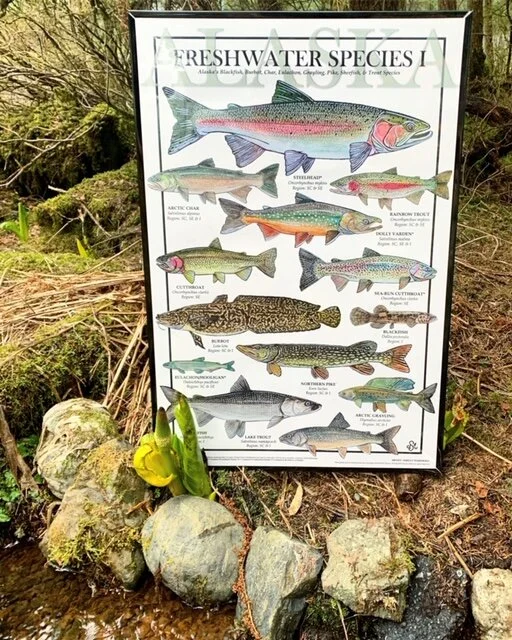 You can now order the Alaska Freshwater Species I Poster! This poster is an illustration of some of Alaska’s most popular freshwater fish and contains 13 different Alaskan freshwater species: Steelhead, Rainbow Trout, Arctic Char, Dolly Varden, Cutthroat, Sea-run Cutthroat, Burbot, Blackfish, Northern Pike, Hooligan, Arctic Grayling, Sheefish, and Lake Trout.