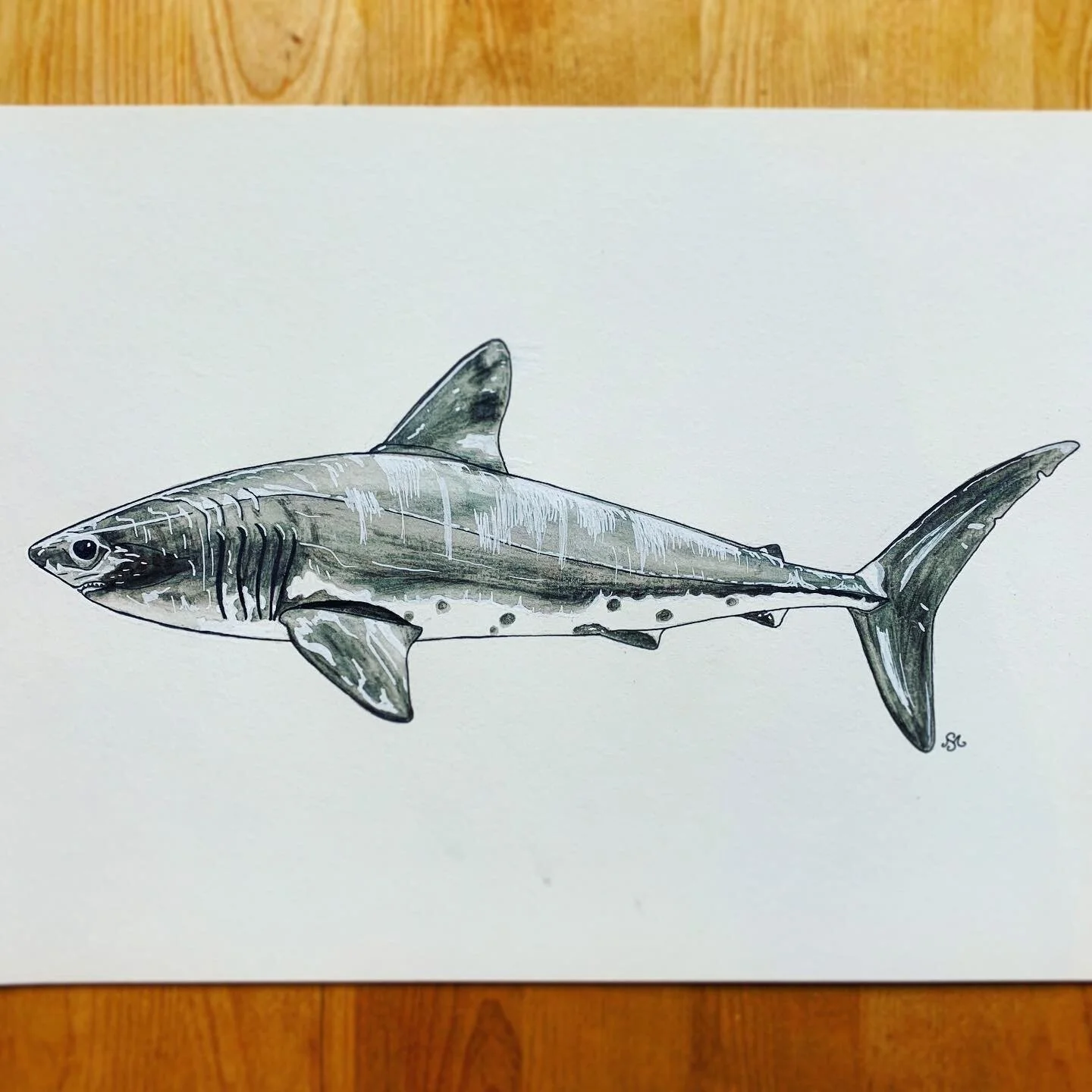 This is a ShellART Salmon Shark limited print. These marine life prints come in three sizes. Each scientifically accurate print is labelled, numbered, and hand-signed by Shelly. These are limited prints and once they are sold out they will no longer be printed.