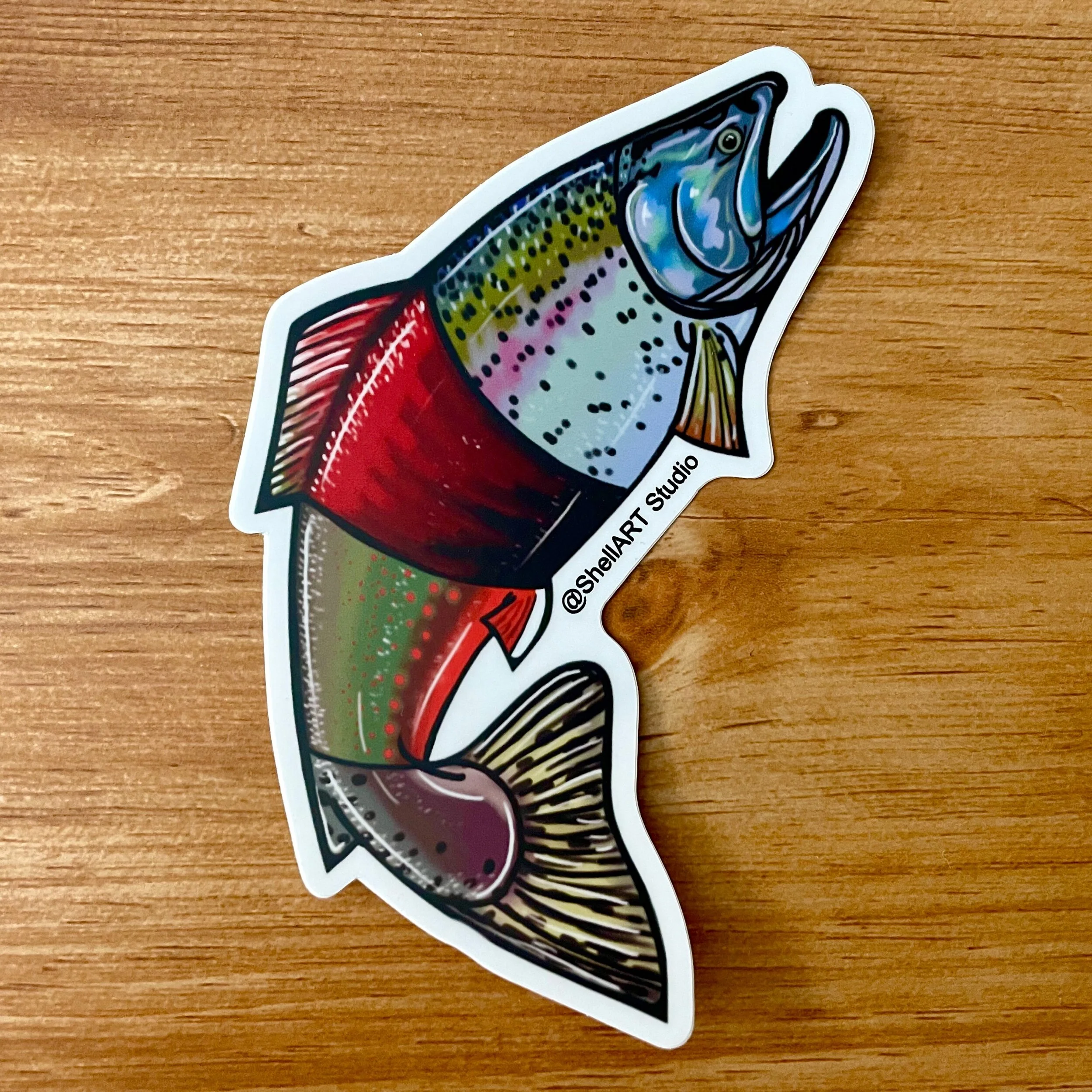 5” by 3” Bucket List Salmonid vinyl decal featuring a King Salmon, Rainbow Trout, Sockeye Salmon, Dolly Varden, and Pink Salmon.